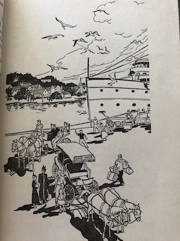 On the boat ride to Mackinac (which they point out is pronounced “Mackinaw” by locals), Taffy meets a boy about her age, David Marsh, who is going to Mackinac to visit his grandmother, and they talk about the sights to see on the island. There is an old fort on the island that is now a historic site for tourists, and David offers to show Taffy around. He tells her where his grandmother’s house is and says that she can come see him there, or he’ll come to the hotel, Sunset House, to see her.