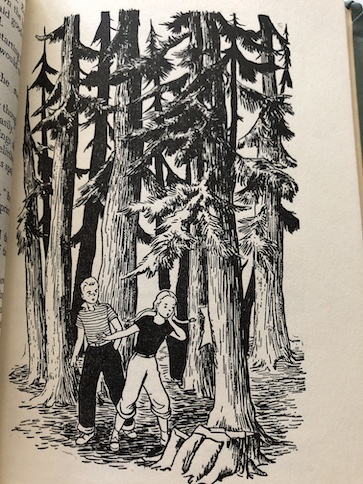 Taffy meets Donna for the first time at lunch. Donna is a shy girl, but she is glad that Taffy is there because she has spent much of her time alone since children are not usually allowed at Sunset House. Taffy asks Donna about Celeste and what she means about the “goblin wood.” Donna explains that Celeste and her family have lived on Mackinac for a long time because they are descended from fur traders (this is why Celeste has a French name, although the book doesn’t mention it directly) and Native Americans (the book uses the word “Indians”). Because of this heritage, Celeste has a lot of superstitions about the island and the spirits that supposedly inhabit it. Taffy doesn’t believe in spirits, but she can’t resist taking the shortcut to David’s grandmother’s house, just to see what it’s like. She has an odd encounter in the woods with a Native American boy (called an “Indian”) wearing overalls, who refuses to speak to her and seems hostile toward her.