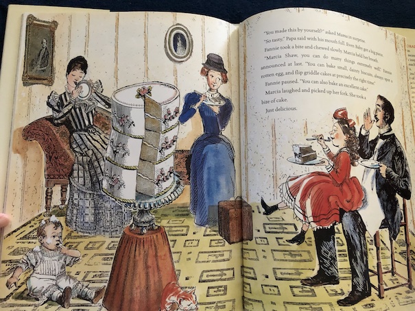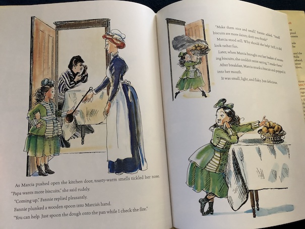 Before Fannie leaves the Shaws, Marcia borrows the cooking notebook and makes a special cake for Fannie to show her what she’s learned. The cake comes out just right because Marcia has followed Fannie’s directions.