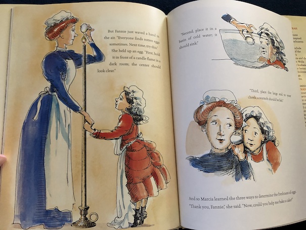One of the things I liked about this book is the illustrations. There are eccentric details in the pictures that add humor to the story, like how Marcia stacks a bunch of chairs on top of each other while making candles, so she can make them extra long, and one of her extra long candles appears later, when Fannie shows her how to tell if an egg is fresh by holding it up to a light. For some reason, Marcia’s mother also has a weird habit of licking her dishes when she’s eating one of the yummy recipes, and there is one picture where it looks like she’s lost control of the baby carriage, and it’s rolling away with the baby. I’m sure these aren’t historical details and were just thrown in to be funny.