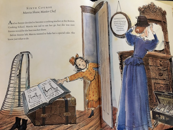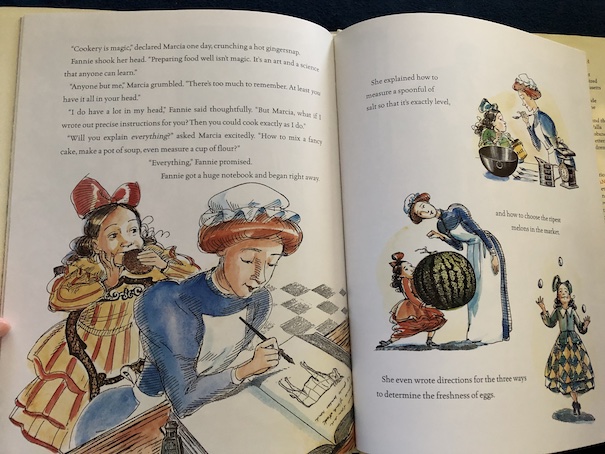 This is the story of Fannie Farmer and her famous and popular cookbook! When I first heard of the Fannie Farmer Cookbook (originally The Boston Cooking-School Cook Book (1896)), I wasn’t sure whether Fannie Farmer was a real person or if that was just a pseudonym or a marketing name for the cookbook, but Fannie Farmer was a real person in the late 19th century, and that was her real name. The story in this picture book is based on her real life, although details may be fictionalized, and the pictures give the story humorous twists.