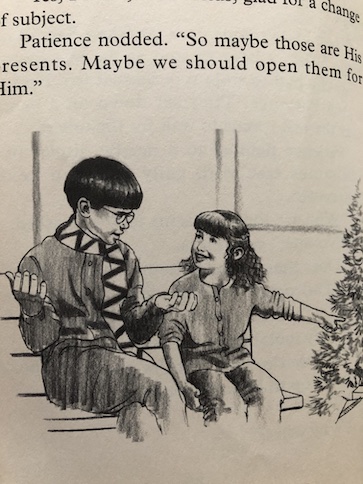 It’s Patience who really solves the mystery of what the clues in the message mean, and that’s both because she is nosy and because, as a young child, she doesn’t take certain things for granted, the way an adult or older child would. Sometimes, people see not what’s actually there but what they expect to see. Titus’s mother didn’t really see him on the escalator alone; she saw the other boy, who happened to be wearing a different black-and-white scarf. She just figured it was Titus because she expected the boy with the black-and-white scarf would be her son, and she didn’t look closer to notice that it wasn’t the same boy and that the scarf actually had a different pattern. It was the same with the teenager who was looking for the other boy. In the case of the clues, all of the older kids assume that the packages underneath the decorative Christmas trees in the department store are just empty boxes, wrapped up for decoration. Because Patience wants to check to see if they’re all empty, she’s the one who realizes that one of the packages isn’t like the others.