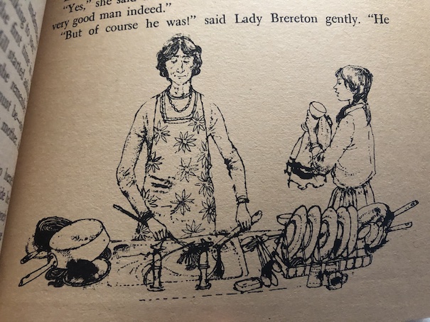 However, he doesn’t survive the mission himself. He is killed by enemy fire, but Lady Brereton reveals that he knew he was ill and dying anyway. One of the pen-and-ink pictures in the book is actually of Sir Rollo after he got shot, and I was a little surprised that the book would show a blood-stained dead body in that way. It’s not overly graphic, even in the illustration, and because it’s a black-and-white drawing, it’s a less alarming than seeing someone with a red blood stain. Still, I think sensitive readers should be aware that it’s there. The book doesn’t sugarcoat the nature of war at all.