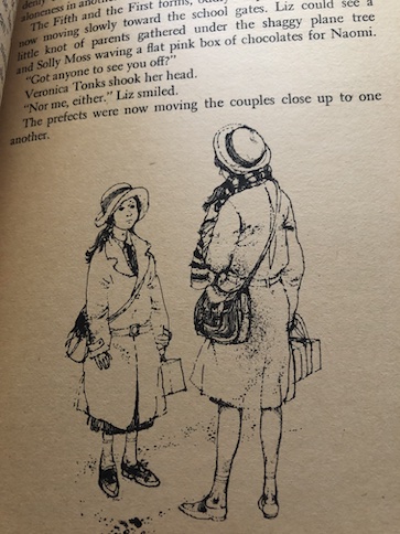 When she arrives at school, she and the other students are told that they are being sent to a small village called Chiddingford in Oxfordshire. It’s such a small town that it doesn’t even appear on the map in their school atlas. There, they will be staying in the homes of people living in the village. The headmistress reminds them all that this will not be an easy experience for them. Many children are being evacuated along with them, and all of them will experience homesickness and difficulties adjusting to the place where they will stay. She urges all of them to be kind to each other and considerate of their hosts in Chiddingford. The girls in Liz’s form (grade) are also going to be paired up with girls in the lowest form because these younger girls are new to the school and don’t even really know each other yet. The headmistress thinks that the experience will be easier on them if they have an older girl as a buddy, like an older sister. Liz pairs up with a shy girl named Veronica, who is wearing a school uniform that is way too big for her. Her parents were trying to save money by buying her a uniform that she could grow into. It makes Veronica a laughingstock among the other students, but Liz sympathizes with her, knowing what it’s like to worry about money and to feel different from everyone else.