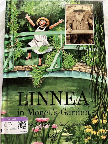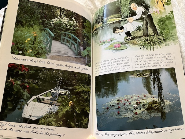 One of the best moments for Linnea is that she is able to stand on the Japanese bridge in the garden, over the lily pond, as she always imagined she could do when she looked at the pictures in Mr. Bloom’s book! Monet painted pictures of that bridge multiple times. Each painting looks different because he painted them at different times and in different weather, so had different impressions of the bridge each time. The book shows Monet’s paintings of the bridge and how different they are from each other, and Linnea tries to capture her own impressions of the bridge.