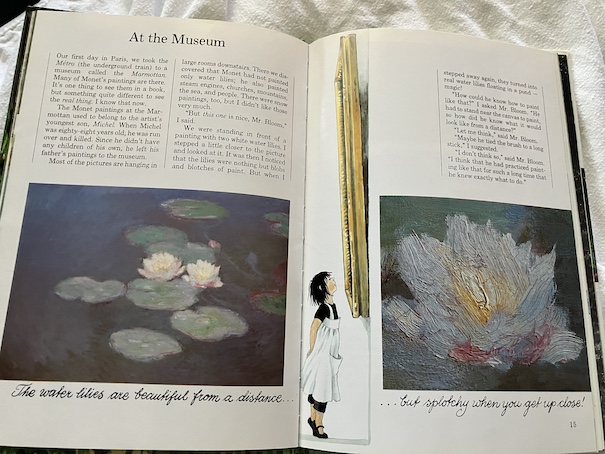 On their first day in Paris, Linnea and Mr. Bloom go to the Marmottan Museum to see Monet’s paintings. Monet’s youngest son left his father’s paintings to the museum when he died because he had no children of his own to inherit them. Mr. Bloom explains to Linnea that Monet painted in the impressionist style, which means that he tried to capture the rough images and impressions of the moment rather than creating detailed, completely realistic paintings. (I’m nearsighted, so impressionist paintings always look to me like what I see when I’m not wearing my glasses. I see colors and rough shapes, but everything is fuzzy with no sharp lines or fine details. I can still tell what objects are without my glasses, but nothing is distinct. I have impressions of things.) Mr. Bloom says that Monet particularly liked to show how light reflects off water and other objects in his paintings.