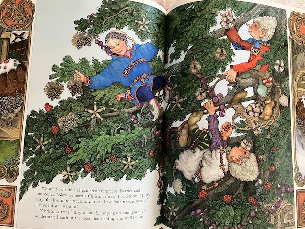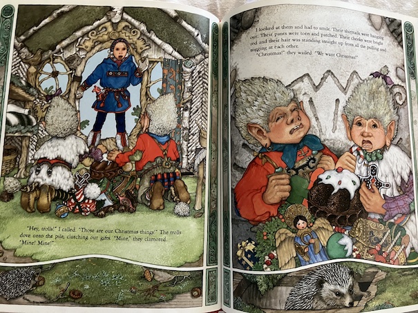 Treva begins to realize what is causing these disappearances when she spots their Christmas pudding, apparently moving quickly across the snow, stuck to the back of a hedgehog! Treva follows the hedgehog and pudding into the forest, where she finds two trolls, pulling the pudding up into their tree house.