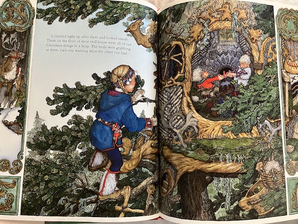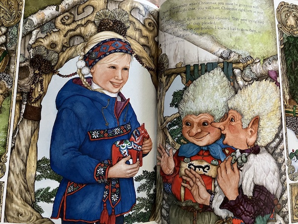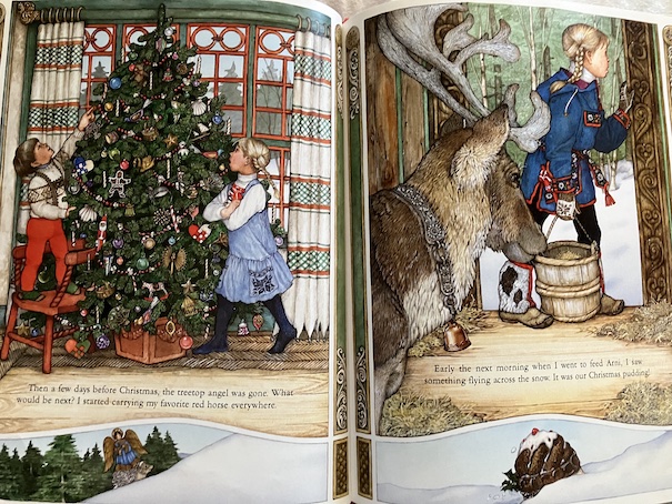 This is a fun Christmas story with beautiful, colorful illustrations! I really loved the pictures in the book, with all the colorful Christmas decorations. The designs of the family’s Christmas decorations are traditional Scandinavian decorations. The side and bottom panels of the illustrations also explain some of what’s happening even before the main character understands.
