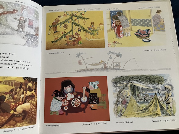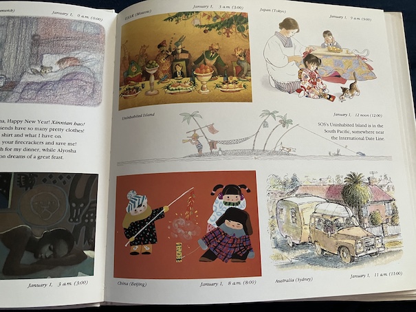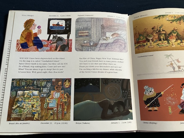 Children in Brazil are making and flying kites with their family and going swimming at the beach. People in Australia also go to the beach because it’s summer there in January, and they camp out overnight. A boy in the US sneaks out of bed to get a look at the party his parents are having at midnight, and is woken by his cat the next morning. The boy in England wakes up his too parents early in the morning by playing his trumpet. People in Kenya go a busy market and have dinner as a family. Children in China set off firecrackers, watch fireworks, and eat special foods. The story in Japan is about a little girl whose toy is stolen by a dog, and her cat chases after the dog to get it back. At first, they worry because the cat doesn’t return home for dinner, but the cat eventually comes in late with the toy, eats its fish, and goes to bed. Because this book was written in the 1980s, the book refers to Russia as the Soviet Union. The boy in the Soviet Union goes sledding with his friends and tries to ride his bike in the snow, which doesn’t work well. Children in various countries watch tv and read books during the day, and readers get to see their dreams when they sleep. At the end of the book, SOS sees a ship coming to pick him up at 9 am on January 2.