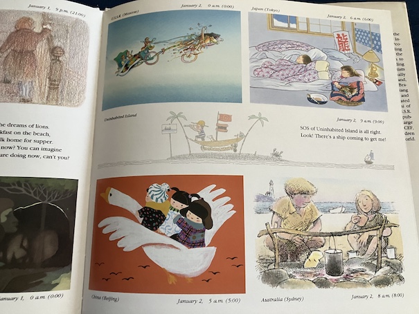 Mitsumasa Anno, the primary author of the book, is from Japan, but he writes as a boy called Sailor Oliver Smith, or “SOS”, who has been shipwrecked with his dog on an uninhabited island near the International Date Line in the Pacific Ocean at noon on January 1 (which is also midnight on New Year’s Eve, Greenwich Mean Time). He is on the island for a full day before he is rescued, sending out appeals for help and thinking about what other children around the world are doing at every hour of the day as they celebrate the New Year.