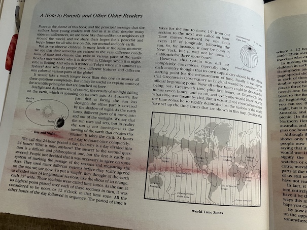 The format of this book is a little unusual. The book was a cooperative project among authors and illustrators from different countries to show children what is happening around the world at the same moment in different time zones.