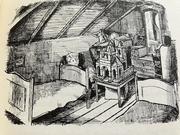 As Eleanor and Edward look at the house from the outside, they suddenly realize that there’s an window at the top of the house that’s shaped like a key and made of colored glass. They’ve never seen that window from the inside of the house, so there must be a secret room! The children search the attic and find a trap door that they never realized was there before. When they look into the hidden room, they find a pair of children’s beds and toys.