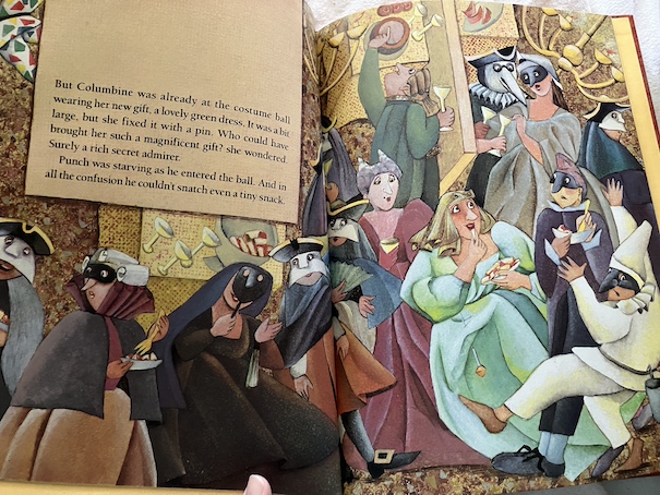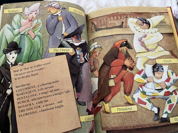 What I love about this book is that it’s a fun introduction to commedia del arte and its stock characters! A figure that looks like Charlie Chaplin holds a card that summons readers like guests to a play and introduces our characters like this: