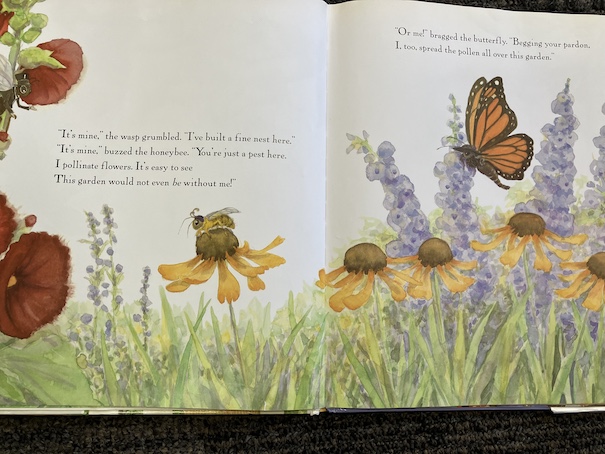 Various other creatures, big and small speak up, each of them pointing out that they live in the garden, what they’ve done for the garden, and what the garden has done for them. The bees and butterflies pollinate the flowers.
