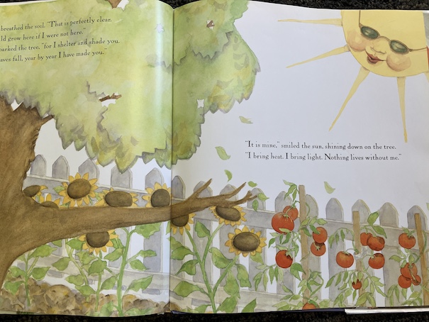 This is a charming story about how various plants, animals, creatures, and forces of nature are interconnected. The book doesn’t use the word “ecosystem“, but that’s the concept being described here. The garden’s ownership and the reason for its existence is much more than the gardener who owns the land and planted and tended the garden; it’s everything that’s growing in it, everything that contributes to its growth, and everything that depends on the garden. Without all of these creatures and natural forces put together, the garden wouldn’t be what it is.