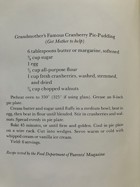 The book includes a recipe for Grandmother’s Famous Cranberry Pie-Pudding.