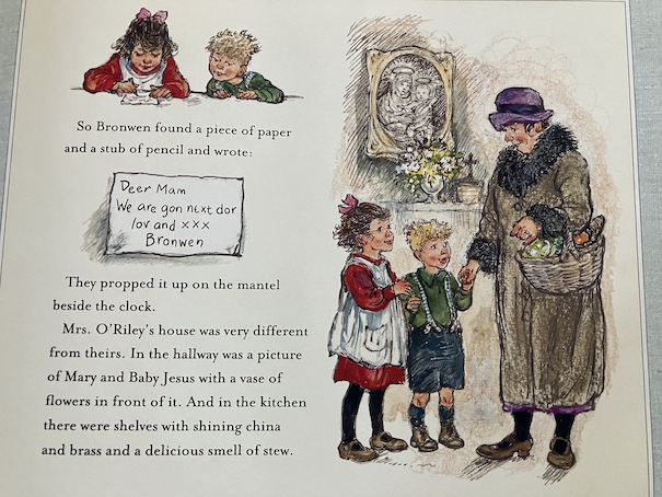 In real life, in the modern world, I wouldn’t recommend small children going into a neighbor’s house without their mother’s knowledge and approval, but in the story, it works out for the best. When Bronwen and Dylan’s mother finds out how Mrs. O’Riley helped look after the children when they were alone and scared, she realizes that she can trust the O’Rileys. Mrs. O’Riley even offers to look after the children sometimes when their mother needs to go somewhere, and the children’s mother is grateful. It’s difficult for her, being on her own and not living near other relatives, who could help look after the children. She needs someone to rely on for help sometimes, and the key to finding someone is being open to getting help from people around her, regardless of their religion.
