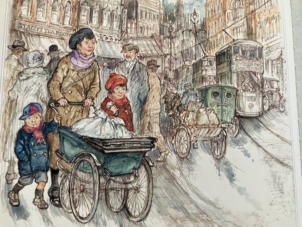 Although this story never explains what year it takes place, it appears to be set during the Great Depression. (Although the Great Depression started in the United States, and this story is set in England, economies all over the world are and have been connected to each other. When one country’s economy experiences something catastrophic, it affects everyone else. The Great Depression was a worldwide event.) The setting is partly in the way people are dressed but also in their circumstances. The way the mother does the laundry is an old-fashioned, labor-intensive process. More tellingly, not only is the children’s widowed mother poor and struggling to get by as a laundress, but the O’Rileys are struggling, too. The children in the story know that Mr. O’Riley and his grown sons often work at the docks, and when there’s no work for them there, they hang out on the street with other men looking for work, and they don’t always find it. This is a time when everyone is poor and suffering. In the back of the book, the author explains that the story was based on her own memories of growing up in Liverpool in the 1930s.