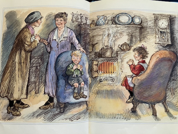 I enjoyed the old-fashioned charm of the pictures in the story. The family lives in a small, old-fashioned house, and they are obviously poor, but at the same time, it’s charming and cozy.