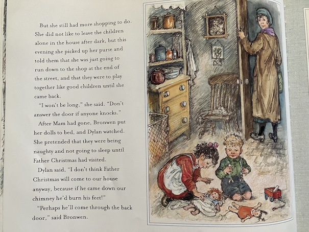 As Christmas approaches, “times are hard”, and the children’s mother doesn’t have much money. She saves what she can to give the children a bit of a treat, but she can’t spare much. Although their mother doesn’t like leaving her young children home alone, on Christmas Eve, the children are tired, and she needs to do a little more shopping. She tells the children to be good, play nicely, and not open the door for anyone and that she will be back soon.