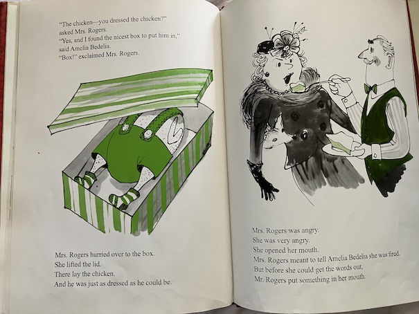 I also don’t think I fully understood the parts about trimming the fat on the steak and dressing the chicken as a kid because I wasn’t used to cooking. I think I got the concept that she was supposed to cut the fat off the steak rather than decorate it as one might trim a Christmas tree (a concept that Amelia Bedelia interprets the opposite way in her Christmas story). What she was supposed to do with the chicken she ended up “dressing” in clothes was a little more confusing. When I was a kid, I knew that people make stuffing or dressing to put in poultry, like chicken or turkey, when they cook it, or they can rub herbs and spices under the skin for flavoring, and I think that’s what Amelia Bedelia was supposed to do here. Even so, there are different types of stuffing or dressing to make and different mixtures of herbs and spices to use, and Mrs. Rogers doesn’t say what kind she wants. Of course, if she was more specific, Amelia Bedelia couldn’t have gotten so confused, and that’s really the point of the story.