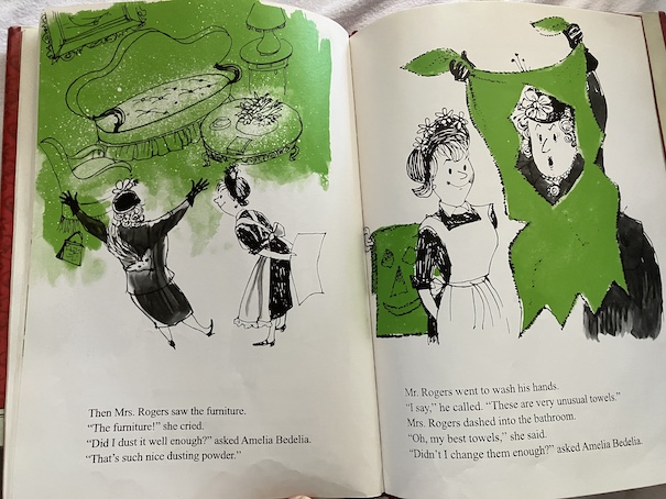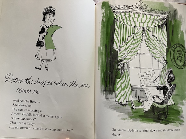 When Amelia Bedelia reads that she’s suppose to “change the towels”, she thinks that she’s supposed to change the way they look instead of replacing them with new ones. To Amelia Bedelia “dust the furniture” means to add dust to the furniture instead of removing it. The instruction to “draw the drapes” sounds like she should draw a picture of them instead of closing them.