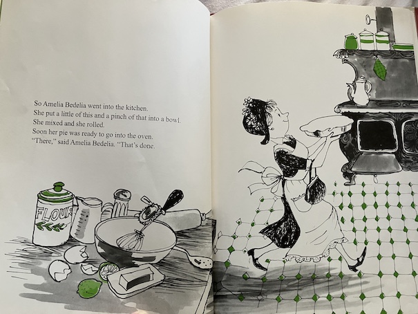 The pattern established in this first book continues through other books in the series. In many other Amelia Bedelia stories, Amelia Bedelia misinterprets instructions she’s given by taking things too literally or misunderstanding words with multiple meanings, but she always manages to keep her job because she’s really good at baking and makes cakes, pies, and other treats that Mr. and Mrs. Rogers love.