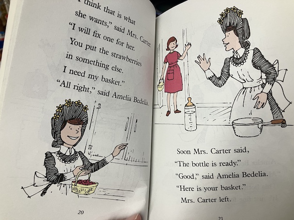 When the baby starts to cry, Amelia Bedelia consults the list and sees that she’s supposed to give the baby a bottle. She worries that a baby might break a bottle, though. She tries giving the baby a box and a can instead, but of course, that doesn’t work. Fortunately, Mrs. Carter stops by to drop off some strawberries and helps to fix the baby a bottle.