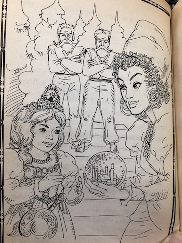 Because this story is meant for young children, Demetra makes the mistake of entering into a suspicious trade with a shady character, apparently not having had the “stranger danger” warnings and not heeding her friends’ concerns. Of course, it turns out that the lock of hair she traded for the magic ball was important because it gives the person who holds it power over her and her kingdom. To save her kingdom, she has to get her lock of hair back.