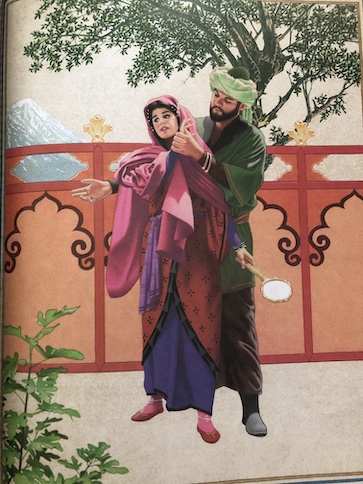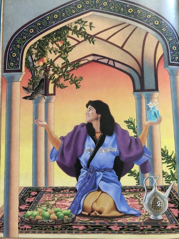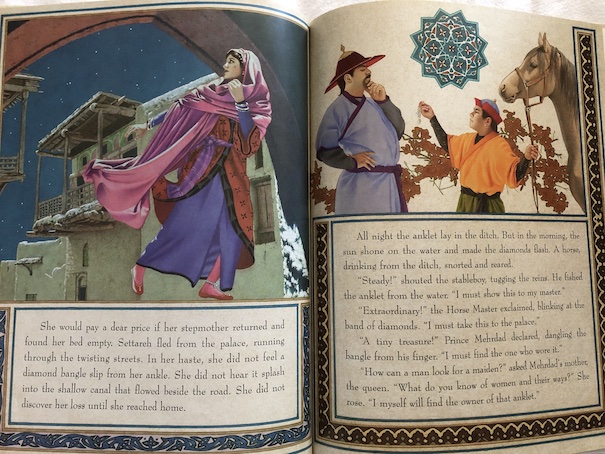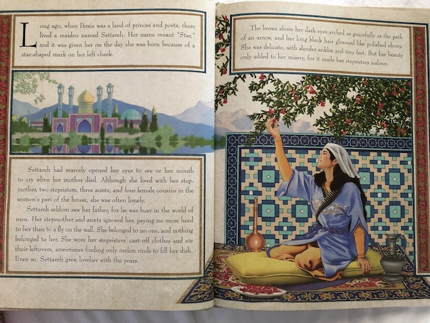 There is a lovely girl named Settareh, a name that means “star” because she has a star-shaped birthmark. Her mother died shortly after she was born, so she has grown up with a stepmother, two stepsisters and some aunts and cousins. Her father leaves her to the women of the family to raise, but she is often ignored and neglected by them. Her stepsisters are jealous that she is pretty and are mean to her.