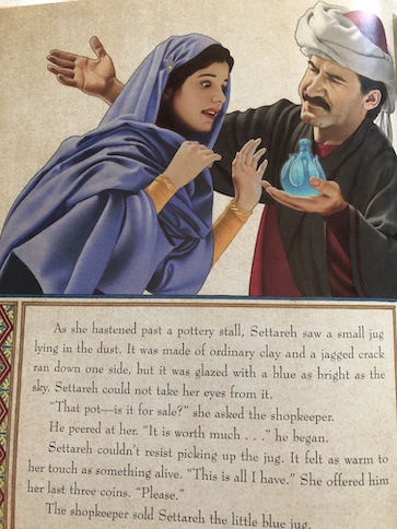 Then, one day, her father visits the women and gives them each some money to buy cloth for new clothes because the princes is inviting everyone to his palace to celebrate the New Year. However, in the market, Settareh spends her money on other things and has none left to buy cloth. She spends part of her money for something to eat because she’s hungry, and then, she gives some to a poor beggar woman as an act of kindness. Finally, she finds herself compelled to buy a strange blue jug. Her stepsisters tell her that she was a fool for buying the jug, which has an obvious crack in it and for wasting the money that she was supposed to spend on cloth, but Settareh still loves the little blue jug.