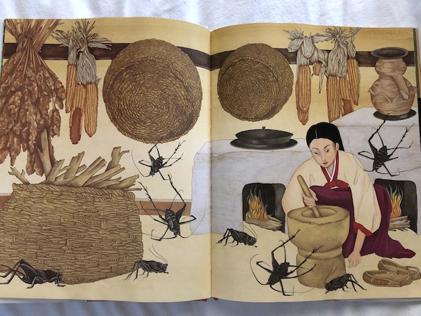 There is an Author’s Note in the back of the book about the background of this fairy tale, and the author notes that there are multiple Korean versions of this story. There’s also an Illustrator’s Note that discusses the style of the illustrations. It explains about how designs that appear in the illustrations are based on designs from Korean temples, and there is also information about the clothing the characters wear.