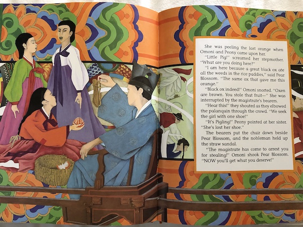 Shirley Climo has written multiple picture books about versions of the Cinderella story form around the world, and it’s fascinating to see how a story that so many of us recognize varies from country to country while still maintaining the same basic pattern. An aspect of this particular version of the story that Climo explains in her Author’s Note is that the animals that help Pear Blossom in the story are sent by a kind of “goblin” called a tokgabi or doggabi. The story itself says this, but in folklore, this kind of “goblin” can represent the benevolent spirit of someone who has died. In this story, the spirit might be Pear Blossom’s mother. This explanation makes sense to me because I remember reading something similar about the Chinese version of the Cinderella story. The story of Rhodopis, which Climo retold in The Egyptian Cinderella, may be the oldest form of the Cinderella story, and it doesn’t have that element of the girl’s deceased mother helping her through trials until she finds happiness, but it does put the concept of the Fairy Godmother from European version of the story in a different light.