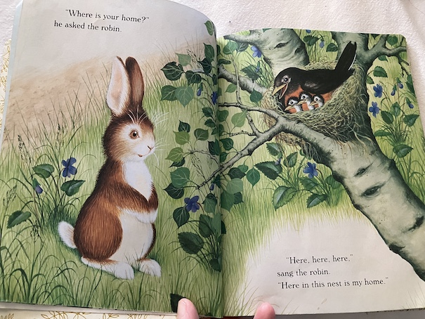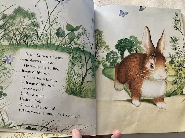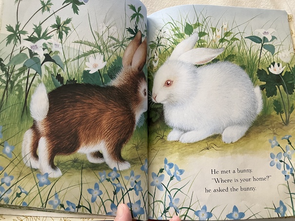 There is a point when the bunny thinks another animal’s home might suit him, when he talks to a groundhog who lives in a log, but the groundhog is not willing to have him as a housemate.