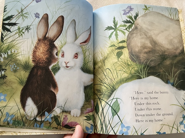 The story also includes the idea is that what makes a home is also who shares that home. The bunny thinks that the place where the groundhog lives could work for him, but he’s not a groundhog and the groundhog doesn’t want to share his home with the bunny. The place where the bunny eventually finds is rabbit hole he can share with another bunny, who is happy to have him as a companion. It’s a calm story with a happy ending because there is a home for everyone and someone for everyone.