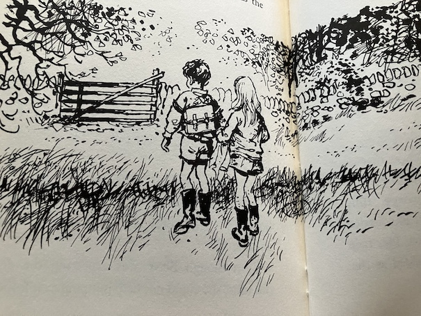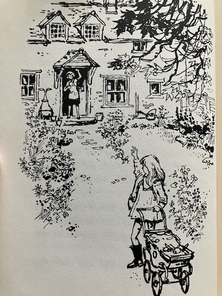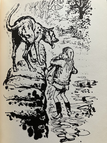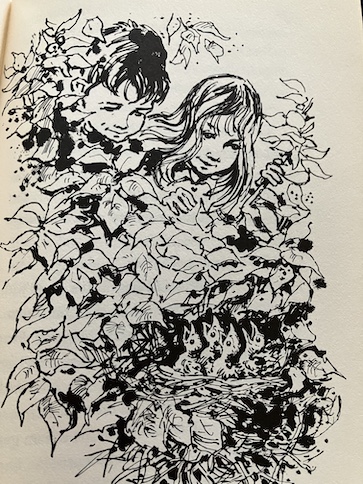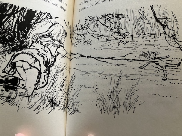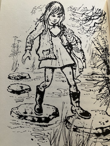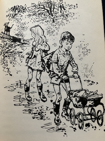 Then, Emma meets up with, Billy, a boy from school. She hides from him because of the state she and Annabel are in, but he spots her because she’s left a few things behind, and Billy plays detective, following the clues. Fortunately, Billy doesn’t laugh at her or her doll. The two of them discover that they share a love for this special spot in the stream, and they trade secrets about it. Emma shows Billy a bird nest she found, and he shows her a hidden spring. Then, he helps Emma to get home, past the farm dog, and stays to tea at Emma’s house.