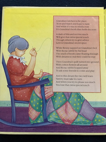 RicRac the Rabbit is planning a party for his friends, but he worries that they won’t like what he’s serving for them to eat. When everyone tries to offer advice and ingredients for the soup, it turns out to be too much advice. Moral: “Too many cooks spoil the broth.”