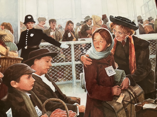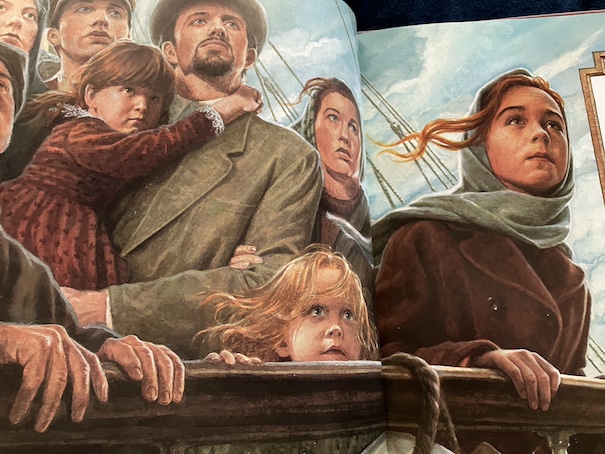 The focus of this story is all on the feelings and experiences of the immigrant family, especially little Krysia. Krysia’s impressions of the journey and the arrival at Ellis Island are all a child’s impressions, and she often needs explanations of what’s happening and what’s going to happen next, which is helpful to child readers.
