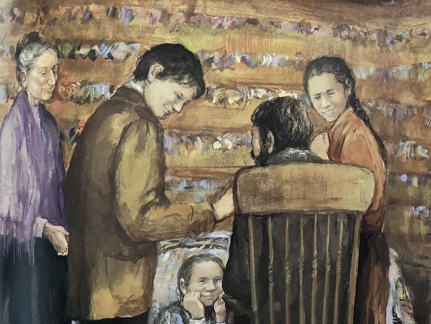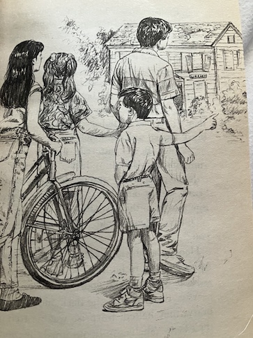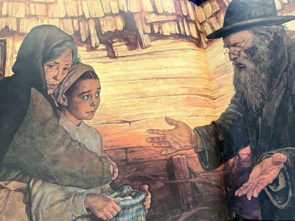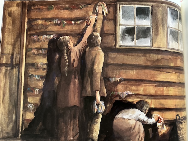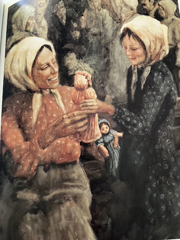 Because it’s Christmas Eve, there is a big Christmas tree, covered with lights and toys. There is also a man dressed like Santa Claus, although Krysia thinks of him by the Polish name, Saint Mikolaj. They don’t receive any new presents, but Krysia’s mother does have a surprise for her. The best part is when Krysia’s father comes for them and takes them to their new home.