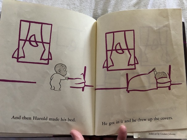 Harold loves drawing things with his purple crayon. In fact, everything in the story is a creation of Harold’s, drawn with his purple crayon.