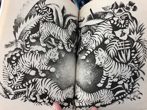 Elmer is found by some tigers who say that they’re hungry and curious to know what little boys taste like. However, remembering some of the cat’s advice, he offers the tigers some chewing gum because (apparently) tigers love it. He also tells them that it’s special chewing gum that will change colors when they chew it, and then, they’ll be able to plant it in the ground to grow more chewing gum. The tigers fall for it and forget about Elmer, who sneaks away.