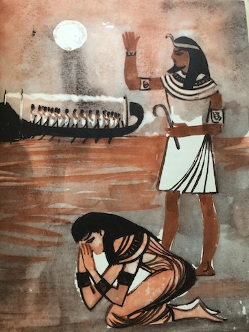 One day, the servants all leave her behind when they go to a special court held by the Pharaoh. While they are gone, a falcon snatches one of Rhodopis’s slippers and flies away. The falcon flies to the court and drops the slipper in the Pharaoh’s lap. The Pharaoh takes this as a sign from Horus that the girl who owns that shoe is destined to be his wife and immediately begins searching for her.