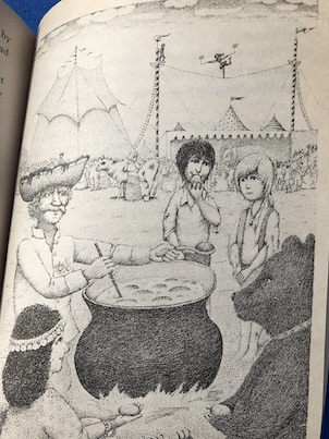 When the two of them are outside of the palace, Jemmy is tempted to run off and leave Prince Brat to fend for himself, but before he can make up his mind about it, the two boys are taken prisoner by bandits, Cutwater and Hold-Your-Nose Billy (named for all the garlic he eats).