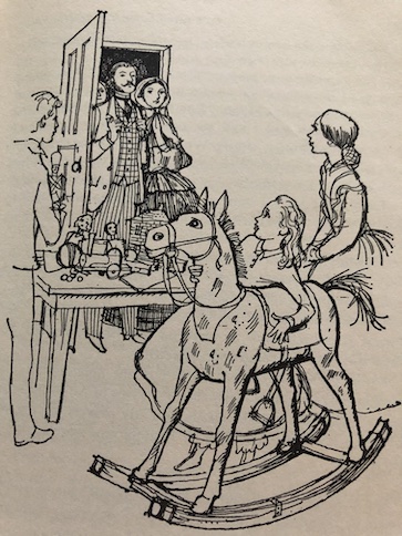 The children’s parents are actually the ones who don’t seem to understand the emotional attachment that people can have to physical belongings. Twice a year, they have their children donated old toys of theirs to the poor, which is a good thing, but poor Maud is traumatized when her parents tell her that she must give up her old rocking horse, Peggy, and that they will replace it with a brand new one. It’s not because Maud has outgrown rocking horses, but Peggy is looking a little shabby from use, and they want the children’s toys to all be in the best condition. They don’t consider the emotional attachment that Maud has to Peggy from her hours of playing with her or that Peggy’s shabbiness is a sign of Maud’s love for her. When they tell Maud that old toys are dangerous for children to play with, Maud asks why they aren’t dangerous for poor children to play with, her mother just tells her not to answer back. (Meaning that she doesn’t have a good answer, and she knows it.) Sebastian says maybe it would be better to just buy the poor children a new rocking horse instead of sending them Peggy, but his father tells him not to be impertinent, showing that this ritual about giving toys to the poor isn’t really about doing something nice for the poor so much as updating the children’s toys for the newest and “best” when that isn’t really what the children themselves want.