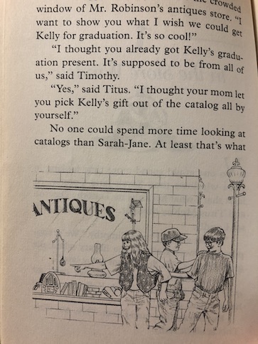 As the kids move Kate’s organ back into position from the cleaning, Anders almost drops his end, and he accidentally opens a secret hiding place in the organ, knocking a hidden book onto the floor. The book contains church hymns in Swedish, but there’s also a torn part of a note in English. Unfortunately, they don’t have enough of the note to really understand what it means. (This is the “hidden message” of the title, and it doesn’t enter the story until about the final third of the book. I suspected it was a Biblical quotation, but I couldn’t place it from the fragment.) The note fragment contains the word “fear”, which makes the children worry that someone might be in trouble and asking for help. Erik asks them when and where they got the organ, but Kate explains that they bought it a few months ago at a fair in Grantsburg, and she doesn’t even know the name of the man who sold it. Papa Nordstrom might know, but since he’s away, they can’t ask him.