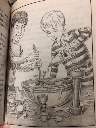 When they stop for dinner at a pizza place, they learn that students from Longmeadow Middle School will be joining them for the camp-in at the museum. By coincidence, Jeanine knows one of the boys from Longmeadow, Jeremy, because she takes horseback riding lessons from his mother. Jeremy ends up joining the others for dinner. Even though Davey rolls his eyes at his little sister’s jokes that Jeanine is his girlfriend, he feel unexpectedly jealous at the way Jeanine blushes around Jeremy.