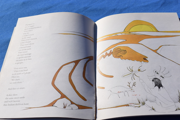 The book continues with a Native American creation myth that describes how the Earthmaker made a little plot of dirt and greasewood grew in it – the beginning of the desert. Then, Coyote scattered seeds to grow cactus, and the Spider People sewed the earth and sky together. In the creation story, other animals help to form the desert, which earns the respect of the Papago. The Desert People recognize that they have to share the land with the animals as well as each other.