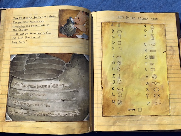 After they get the Stone Chicken back, readers can use the decoder provided to solve the code and learn where the Treasure is. It turns out that the Treasure is actually a recipe, written in the same substitution code – for peanut butter and jelly sandwiches!