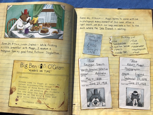 Seymour interviews the suspects one at a time and considers their connection to clues found at the scene of the crime. As an adult, I figured out who the culprit was pretty quickly, but for the benefit of child readers, Seymour provides notes about the clues and suspects to help them understand the connections. The pictures in the story also provide important clues. After Professor Slagbottom’s decoder is stolen, Seymour realizes who the thief is.