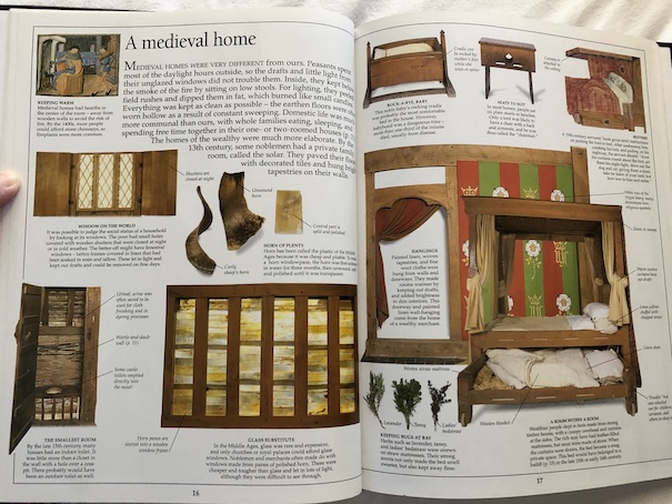 The book explains what would be found in a typical Medieval home. Poor people lived in houses that had only one or two rooms for the entire family. Few people could afford to buy glass windows. Poor people only had wooden shutters to cover their windows. Others might have tallow-coated linen over a lattice frame, which would let in light, and some wealthier people had pieces of polished horn in their windows, which also let in light, although you couldn’t really see through them well. What people ate varied depending on their social status. Wealthier people could afford a wider variety of foods, and poor people mostly ate what they produced themselves.